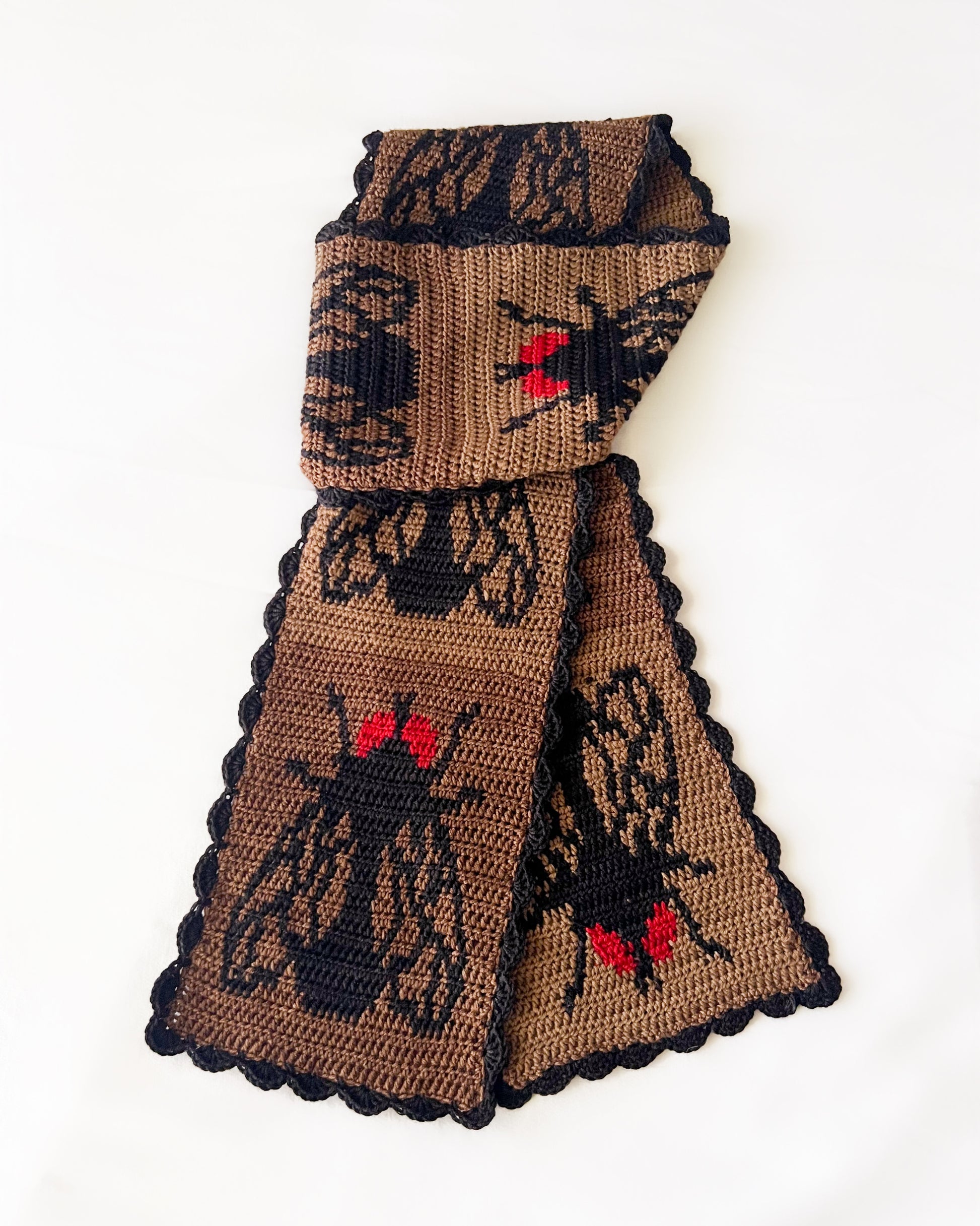 This is an advanced-beginner pattern made up of a variety of demonstrations and techniques used to create the Fly Scarf. Techniques for making the piece include, making a swatch, color changing, reading a graph, and weaving in loose ends & making a scallop border. There are plenty of tutorial links as well to prevent anyone from getting stumped at any point on the scarf making process.