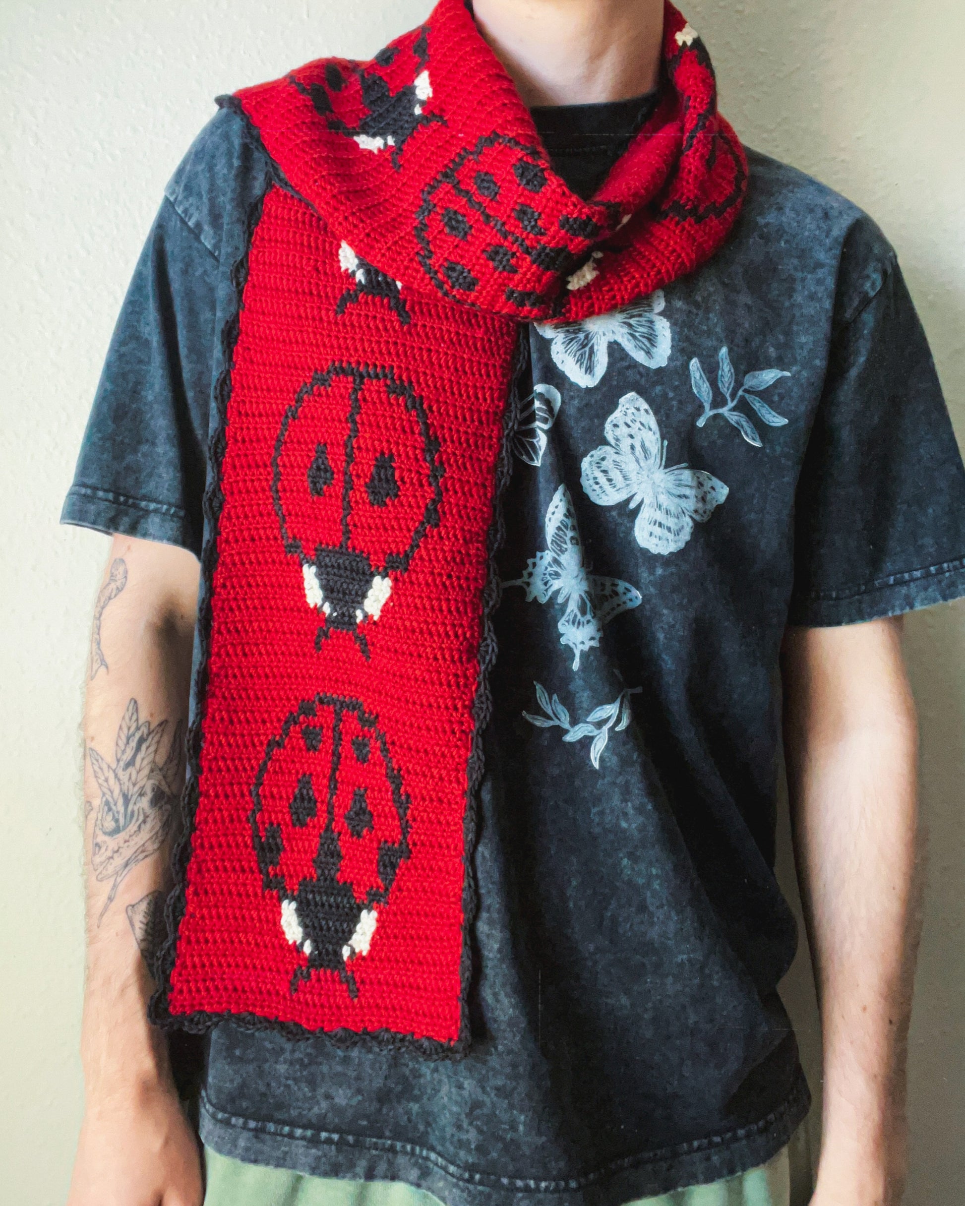 This is an advanced-beginner pattern made up of a variety of demonstrations and techniques used to create the Ladybug Scarf. Techniques for making the piece include, making a swatch, color changing, reading a graph, and weaving in loose ends & making a scallop border. There are plenty of tutorial links as well to prevent anyone from getting stumped at any point on the scarf making process.